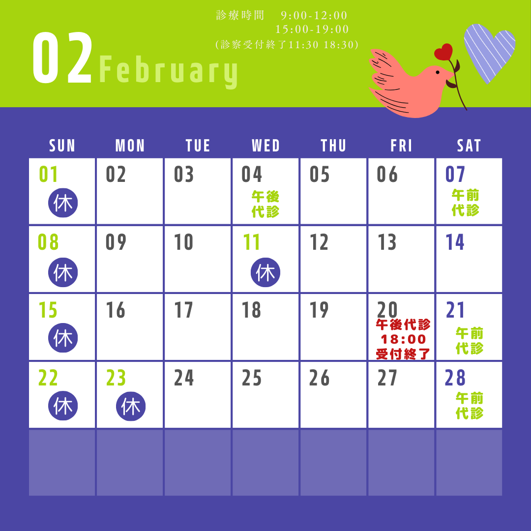 2月20日は代診医師による診療となり、それに伴い受付時間を変更いたしました。