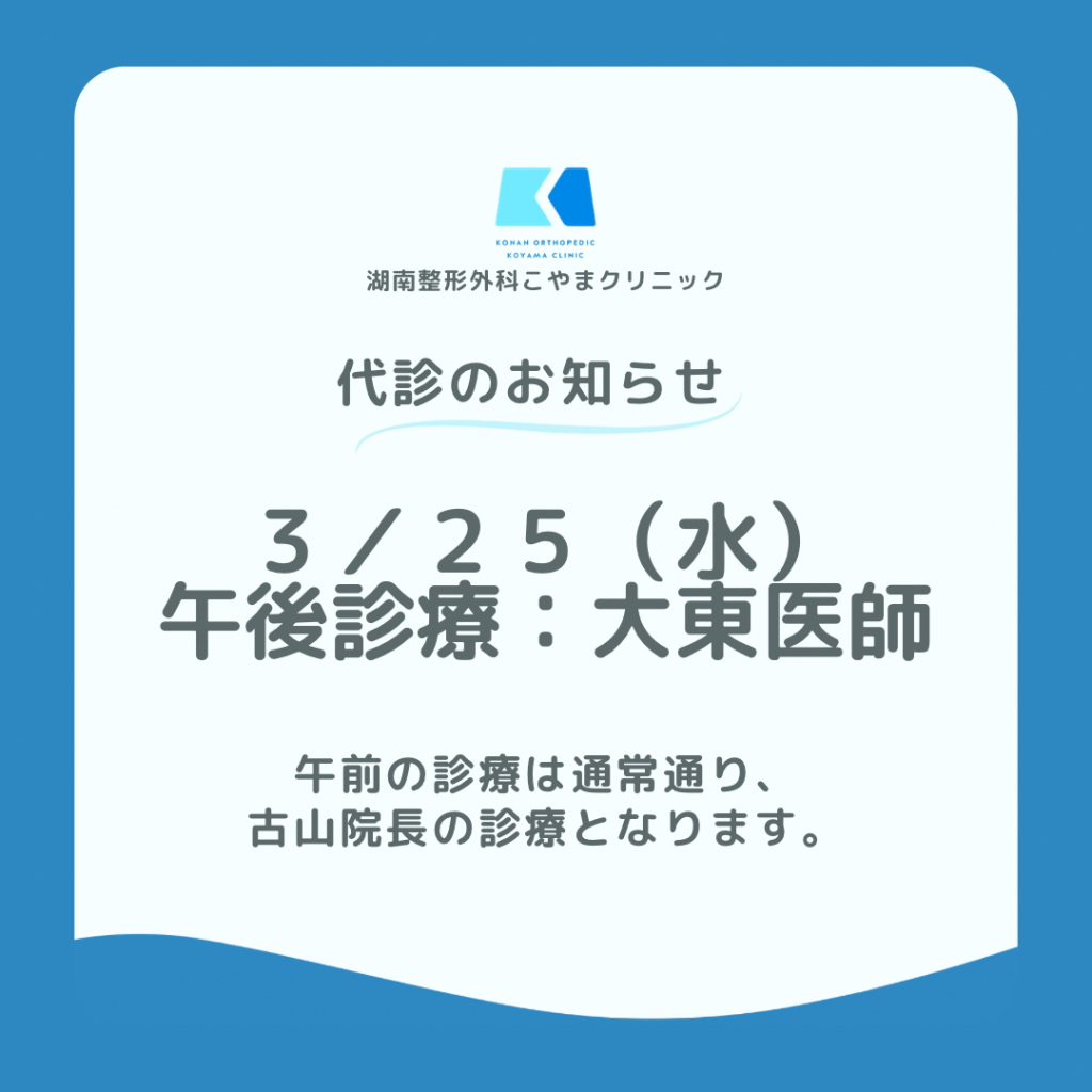 お知らせ代診のお知らせ 3月25日(水)の午後の診療は代診の医師、大東先生の診療となります。午前の診療は通常通り古山院長の診療となります。また3月26日午後の診療は休診となります。ご迷惑おかけしますがよろしくお願いします。